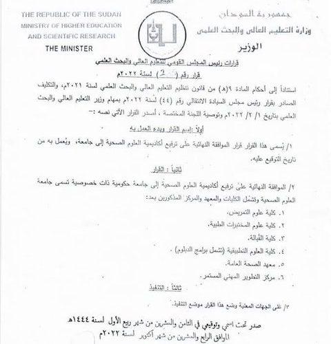 أصدر رئيس المجلس القومي للتعليم العالي والبحث العلمي المكلف د. محمد حسن دهب أحمد، قراراً حمل الرقم (2) لسنة 2022م بالموافقة النهائية على ترفيع أكاديمية العلوم الصحية إلى جامعة حكومية تحت مسمى (جامعة العلوم الصحية) التى تضم عدداً من الكليات.