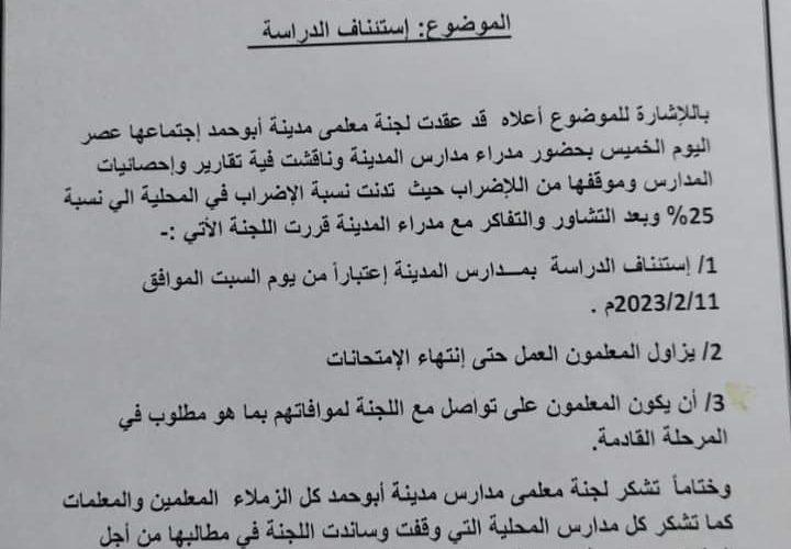 أعلنت لجنة معلمي مدينة أبوحمد بولاية نهر النيل استئناف الدراسة بمدارس المدينة اعتباراً من غد، السبت 11/2/2023م ومزاولة المعلمين العمل حتى انتهاء الامتحانات.