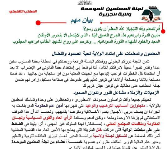 أعلنت لجنة المعلمين الموحدة بولاية الجزيرة تعليق إضراب العزة لمدة أسبوع، ابتداء من الغد، الأحد (5) مارس وحتى الخميس (9) مارس للتأكد من جدية حكومة الولاية.