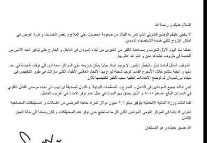 واضاف “نناشد المركز جميع السودانيين في الداخل والخارج والمنظمات الدولية والدول الصديقة ان تهب لنجدة مرضى الفشل الكلوي في السودان والبالغ عددهم (8)الف مريض يحدق بهم الموت في حال عدم توفر الإمداد في القريب العاجل”.