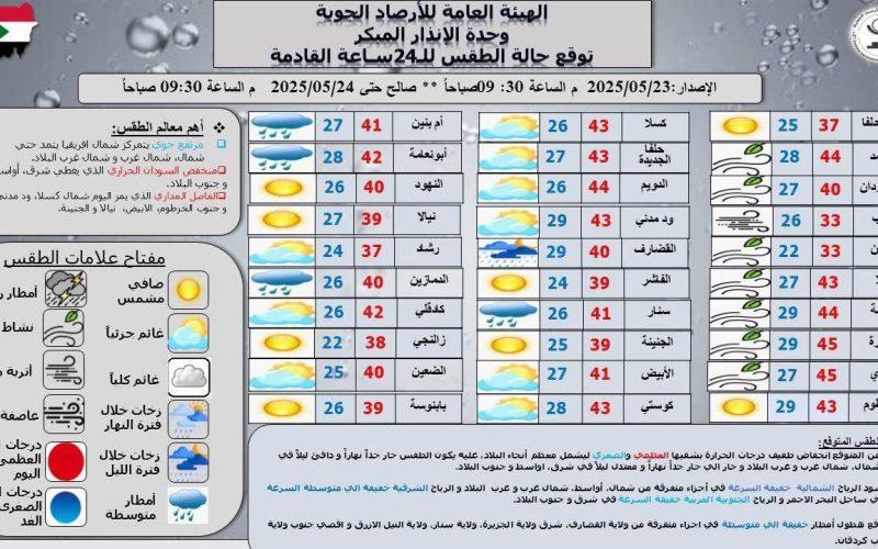 أعلى درجة حرارة: 45.0°م في عطبرة وشندي. وأدنى درجة حرارة صباح الغد: 22.0°م في شلاتين وزالنجي.