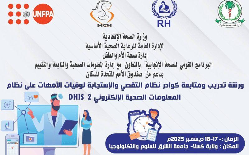 اختتم البرنامج القومي للصحة الانجابية، وإدارة المعلومات الصحية والمتابعة والتقييم بوزارة الصحة الاتحادية، بقاعة جامعة الشرق للعلوم والتكنولوجيا بمدينة كسلا، الورشة التدريبية على نظام المعلومات الصحية الكترونيا.
