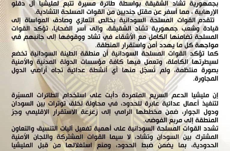 تتقدم القوات المسلحة السودانية بخالص التعازي وصادق المواساة إلى قيادة وشعب جمهورية تشاد الشقيقة، وإلى أسر الضحايا، تؤكد القوات المسلحة تضامنها الكامل مع الأشقاء في تشاد ووقوفها إلى جانبهم في مواجهة كل ما يهدد أمن واستقرار المنطقة.