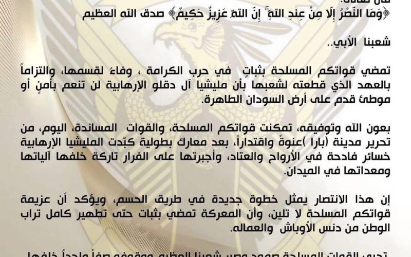 بعون الله وتوفيقه، تمكنت قواتكم المسلحة، والقوات المساندة، اليوم، من تحرير مدينة (بارا) عنوةً واقتداراً، بعد معارك بطولية كبّدت المليشيا الإرهابية خسائر فادحة في الأرواح والعتاد، وأجبرتها على الفرار تاركة خلفها آلياتها ومعداتها في الميدان.