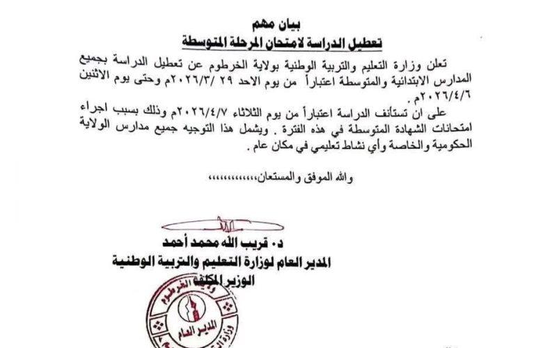أعلنت وزارة التعليم والتربية الوطنية بولاية الخرطوم عن تعطيل الدراسة بجميع المدارس الابتدائية والمتوسطة اعتبارا من يوم الأحد 29 مارس الجاري وحتى يوم الاثنين السادس من ابريل القادم وذلك بسبب اجراء امتحانات الشهادة المتوسطة في هذه الفترة، ويشمل هذا التوجيه جميع مدارس الولاية الحكومية والخاصة وأي نشاط تعليمي في أي مكان .